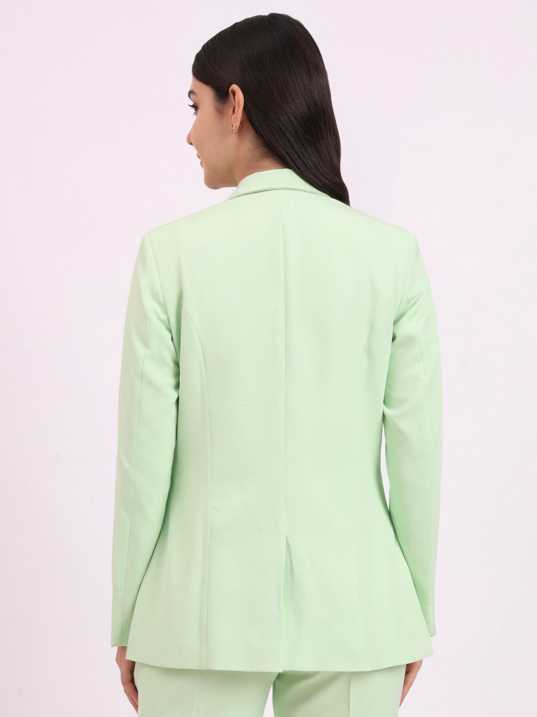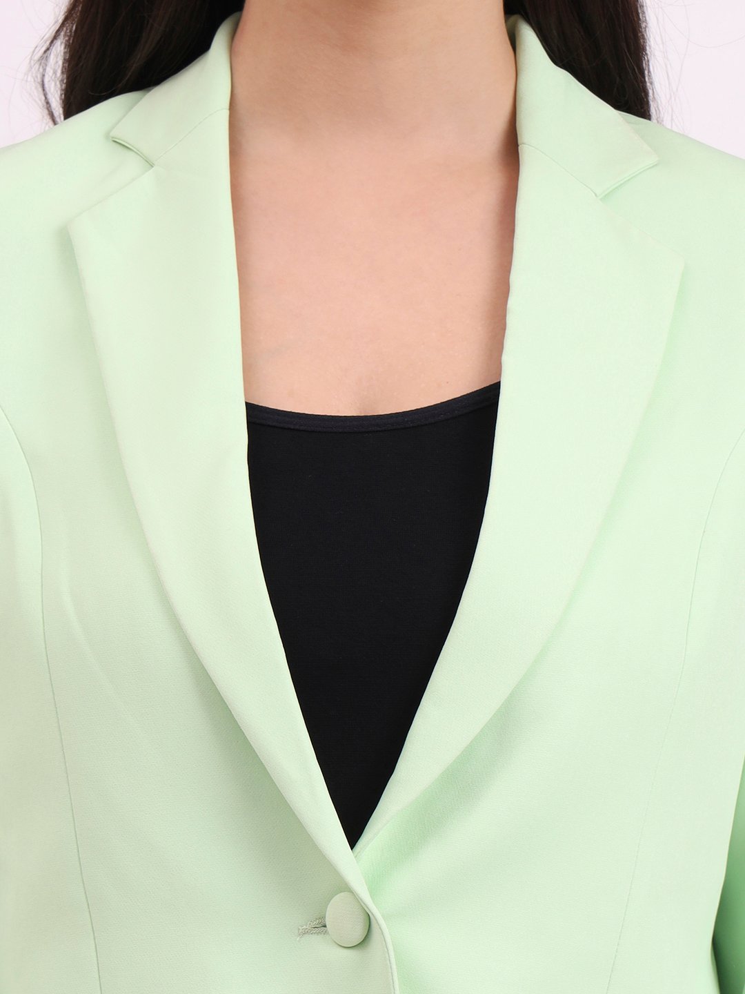 Step into confidence with this green women’s blazer featuring a single button closure, notched lapel collar, and full sleeves. A versatile choice for office and party outfits.