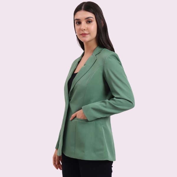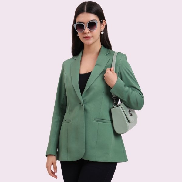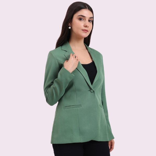 Upgrade your wardrobe with this dark green women’s blazer featuring a single button closure, notched lapel collar, and full sleeves. Ideal for office, meetings & evening wear.